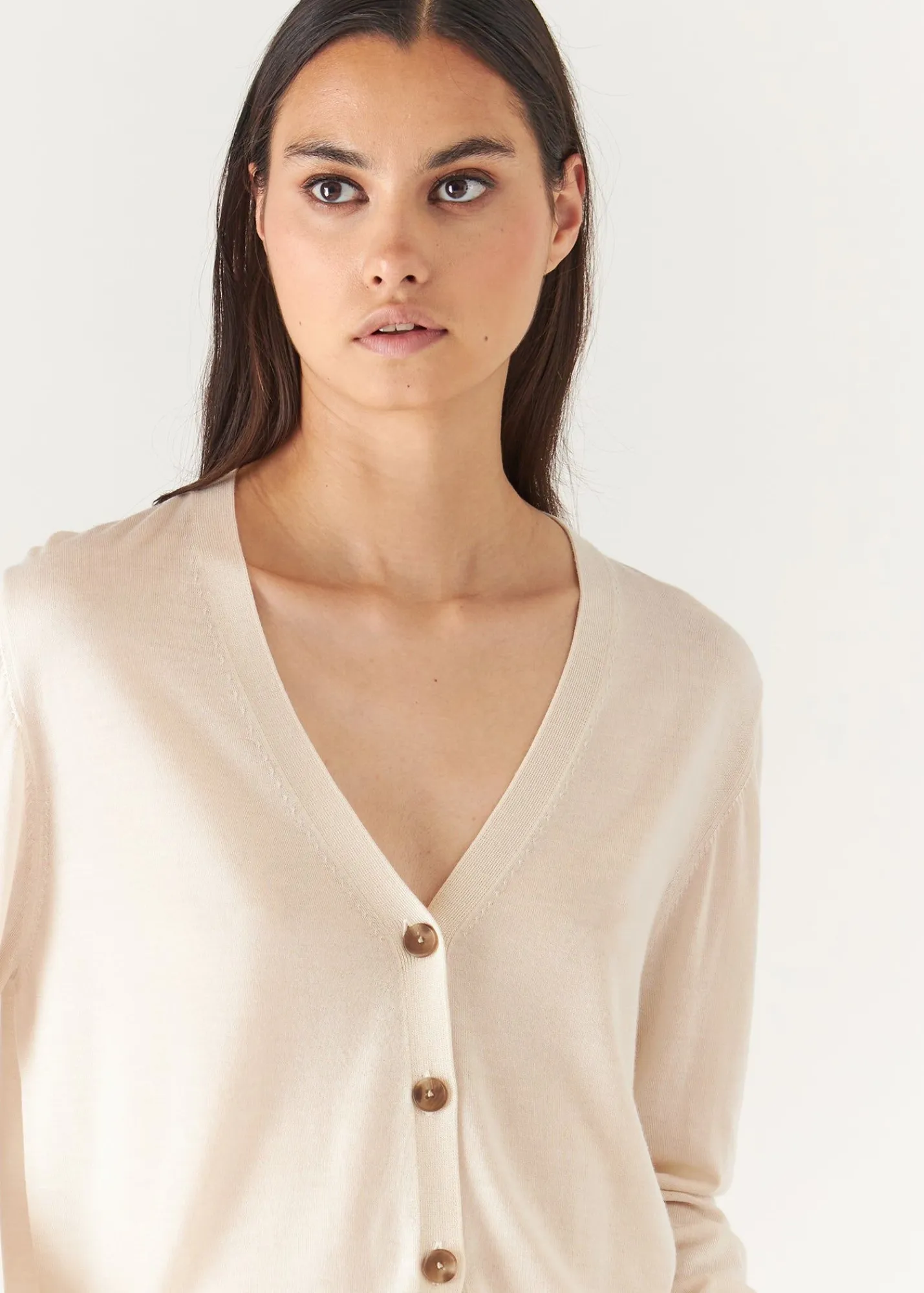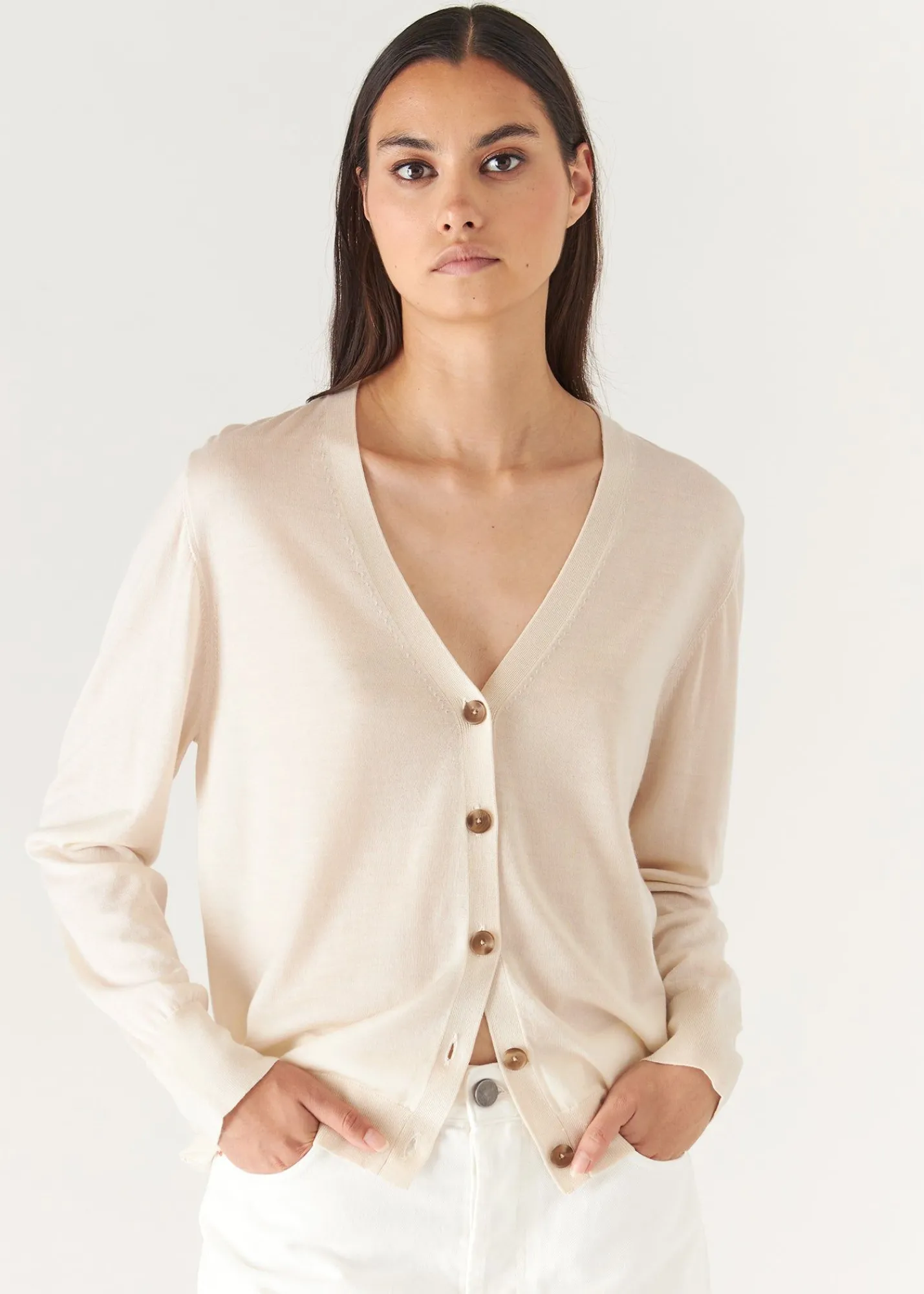 Our Relaxed Cardigan Is Crafted In A Premium Extra-Fine Merino/ Lyocell Blend Yarn. The Lightweight Knit Complements The Relaxed Silhouette As It Drapes On The Body Beautifully. Layer Over Our Scoop Neck Tank For A Monochromatic Spring Look.